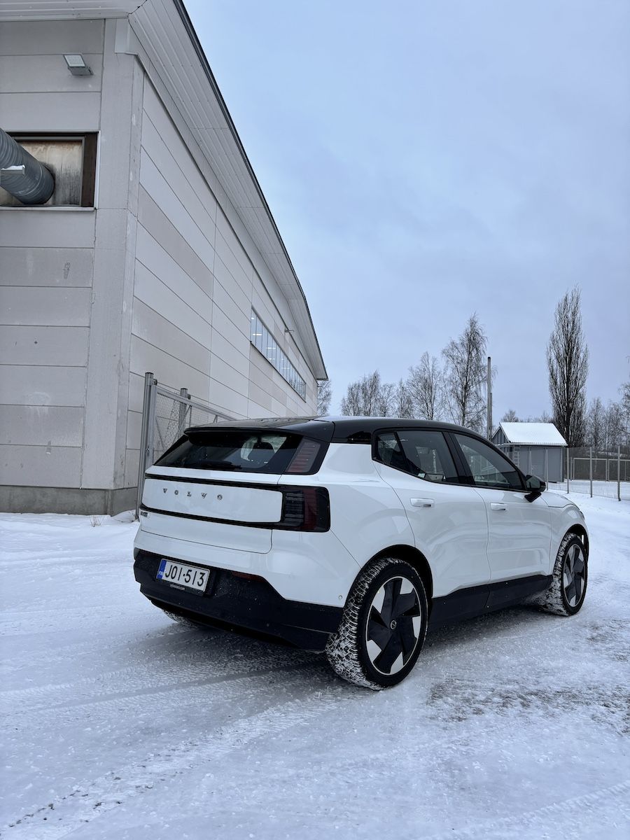 Takavetoinen EX30 on talvikelissä jopa hauska auto: Verrattain pienikokoinen, mutta silti tehokas sähköauto mahdollistaa pienen hauskanpidon, mutta samalla on oltava tarkkana: Liukkaalla kelillä kaasujalan kanssa on syytä olla tarkkana, sillä muuten saattaa löytää itsensä penkasta. Toisaalta takavetoinen auto on osaavissa käsissä miellyttävämpi ajaa kuin yhtä tehokas etuveto, jonka kanssa ajaminen voi olla varsin puskevaa. Alusta on mukavan jämäkkä, jopa urheilullinen. Yhdistettynä melko tarkkaan ohjaukseen ja runsaan viiden sekunnin kiihtyvyyteen sataan kilometriin EX30 tarjoaa riittävästi tehoa ja ajettavuutta vaativammallekin kuljettajalle. Ultra-varustelutasosta jäimme kaipaamaan monipuolisemmin säätyvää kuljettajan istuinta.